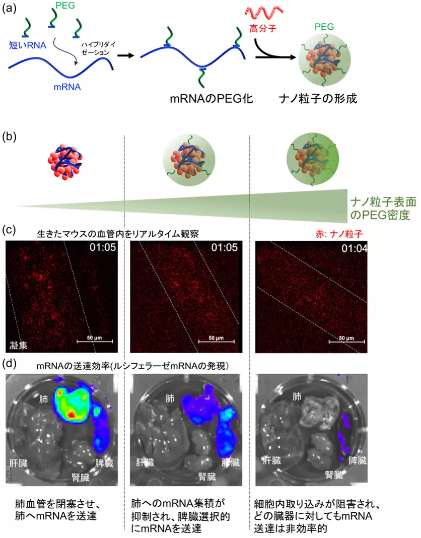 この方法では、mRNAに結合させるPEG の数や長さを変えることで、簡便かつ精密にナノ粒子表面の PEG密度の制御が可能になる。