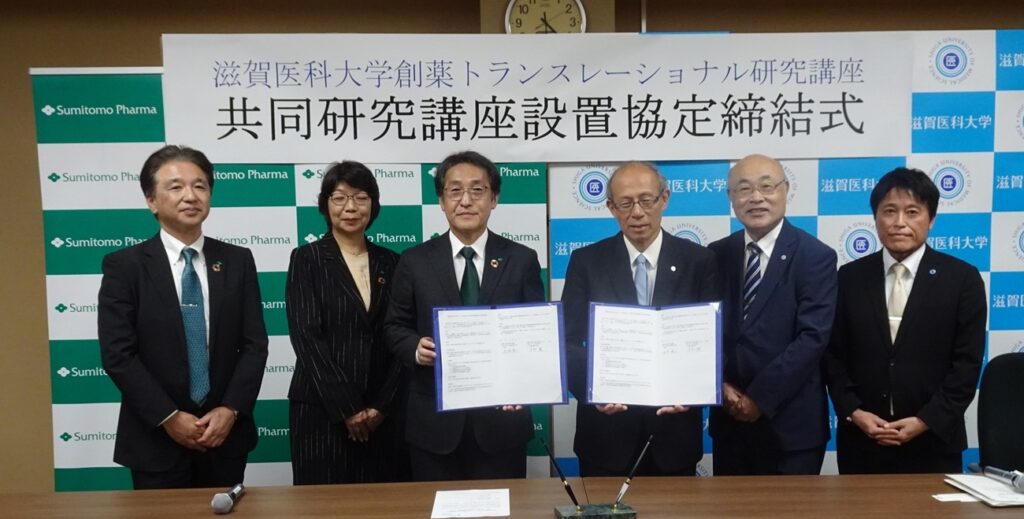 左から住友ファーマ志水勇夫執行役員、佐藤由美常務執行役員、木村社長、滋賀医科大学上本学長、遠山育夫理事、池田特任教授