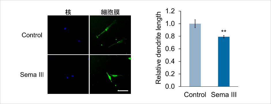 さらに、Sema-plexinシグナルのメラノサイトでの作用を調べるため、培養メラノサイトを用いた評価を行った。PLXNA1のリガンドであるSema-3A(SemaIII)をメラノサイトに添加したところ、メラノサイトの突起伸長を有意に抑制する結果が得られた(図2)。