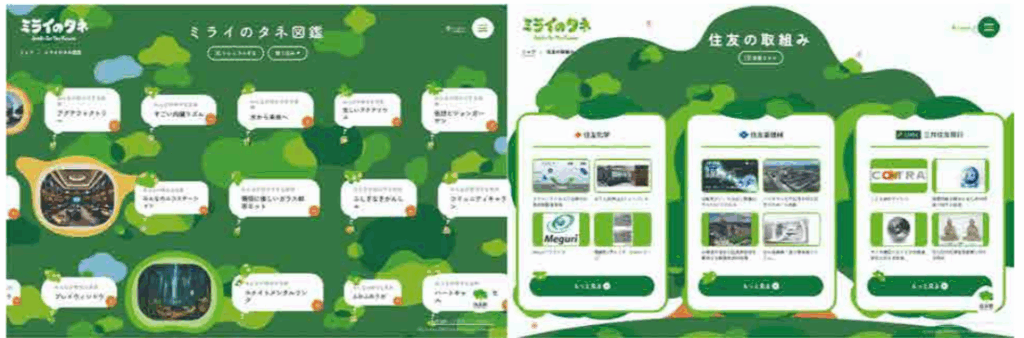 「住友グループの数えきれない技術や取組み」をもとに、⼈類が直⾯する共通課題の解決や豊かな未来社会づくりへの想いを込めて創出されたアイデア「ミライのタネ」。会期中の参加者によっておよそ1万件の「ミライのタネ」がつくられ、世界中に公開された。これらのデータは、およそ700 件の「住友グループの技術や取組み」と共に課題解決や豊かな未来社会の実現を⽬指す貴重な記録としてアーカイブ化される。アーカイブ化の準備が整い次第、住友グループ広報委員会が運⽤するWEBサイト内の新設ページとして公開する。