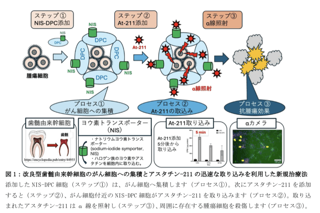 α線は、従来治療に用いられているβ線や、γ線に比べて、高いエネルギーを伝達できるため、がんを効率的に除去できる。また、作用範囲は約100μmで数細胞程度と短く、漿膜側から腸管粘膜を損傷しない。DPCは抜歯した歯からの採取が可能で、他人の細胞でも移植可能という特性を持ち、癌細胞周辺へ移動・蓄積が可能である。
