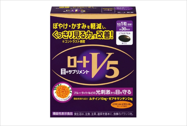 ロート V5 シリーズは、年齢とともに目のぼやけ・かすみなどの悩みが出てきた方へのご提案として、2015 年に同社初の機能性表示食品として発売した製品シリーズだ。ロート V5aは網膜に働きかけ、くっきり見る力を改善することが報告されているルテイン・ゼアキサンチンを含有している。商品特徴は、次の通り。
