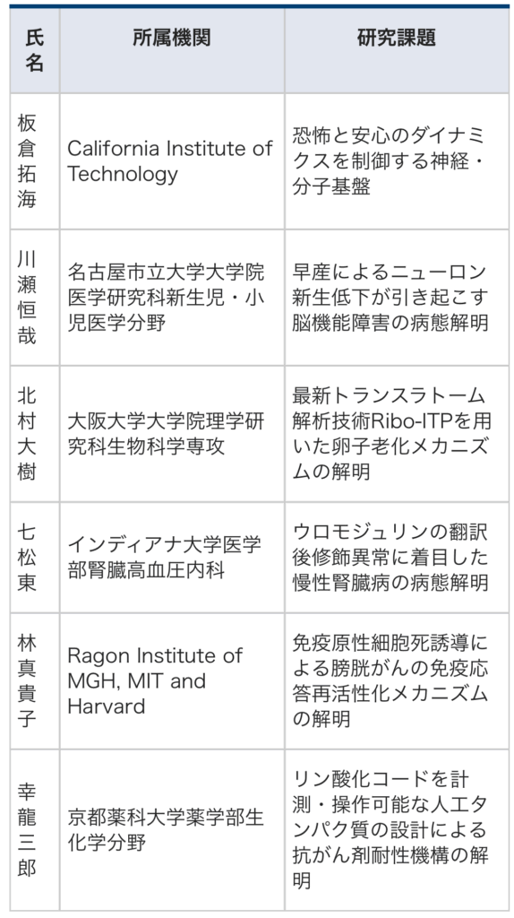 日本生化学会2026年度「早石修記念 海外留学助成」対象者決定 小野薬品 2025.10.31 小野薬品は31日、日本生化学会2026年度「早石修記念 海外留学助成」対象者を発表した。同社では、日本の生化学会に多大な貢献をした故早石修名誉会員(2015年12月17日逝去)の国内外における功績を記念して設立された日本生化学会の事業「早石修記念 海外留学助成」に対して2017年度より支援を行っている。 2026年度「早石修記念 海外留学助成」には71名が応募し、日本生化学会 留学助成審査会における選考の結果、次の 6名が選出された(敬称略)。