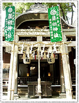 1397年(応永4年)、足利義満が帰国した遣明船から神農の神像を献上されました。これが薬祖(神農)神社の始まりです。 1907年(明治40年)菅原神社に合祀されましたが、第二次世界大戦の空襲により焼失。同55年(昭和30年)、神明造りの本殿と拝殿を造営し、日本最古の薬祖神社として今日に至っています。近年は、癌封じの神様として知られています。