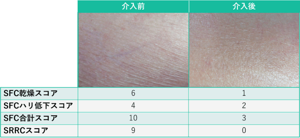 週後(介入後)に、前腕の状態の肉眼的所見を外部試験機関にて看護職者により評価した。評価には、SFC(スキンフレイルスクリー