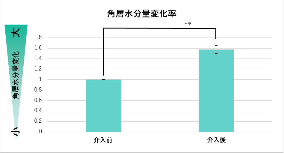 て前腕における角層水分量を Corneometer で測定した。介入前の水分量の平均を1とした場合の、介入後の変化率を求めた。