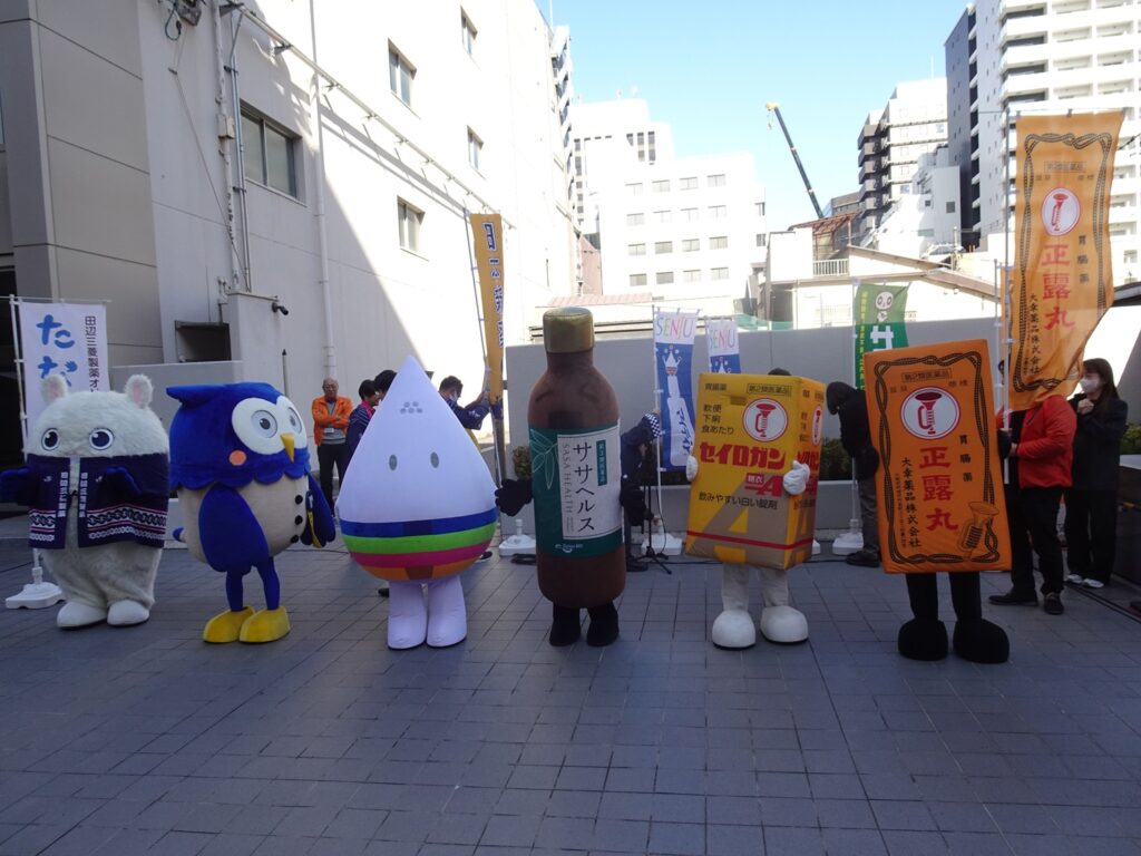 道修町通りも祭りの連日、たなみんやシンヤくん、正露丸くん(大幸薬品)など全ての“くすりのゆるキャラ”達が練り歩き、祭りを盛り上げた。