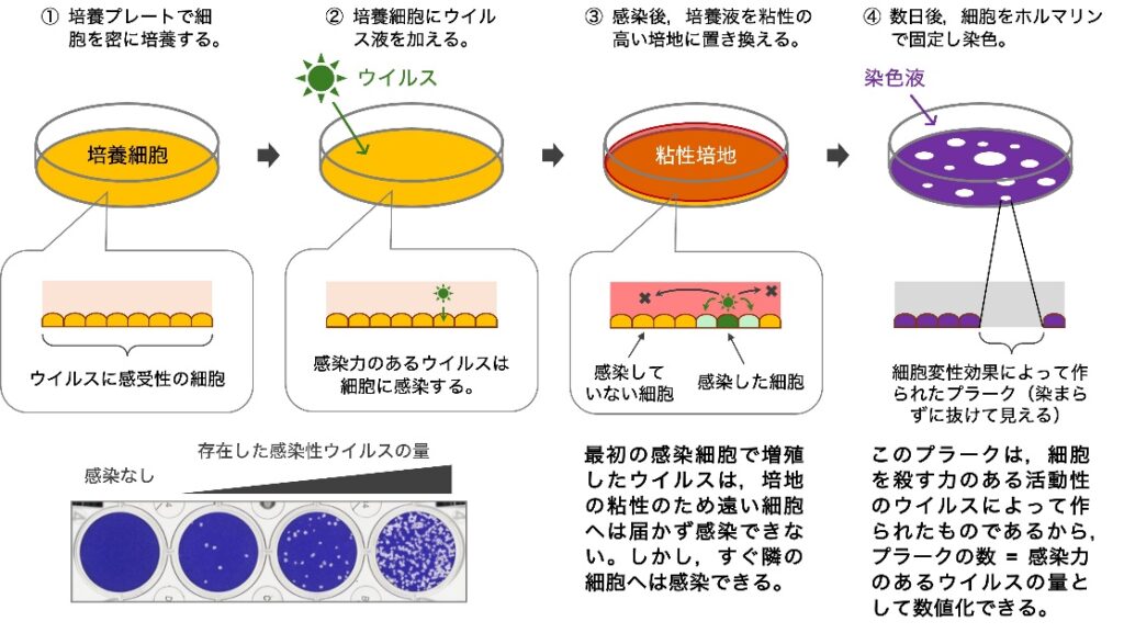 ウイルスの細胞変効果によって死んだ細胞の集団はプラーク(Plaque)と呼ばれるが、プラークが目視で確認できる大きさになると、プラークの数を数えることでウイルスの感染力(感染価)を数値化することが可能になる(図1)。