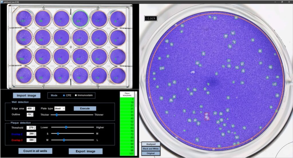 こういった作業負担の軽減や結果の均一性を目的として、同研究では、ウイルスプラークを自動的に識別しカウントするソフトウェア 「plaQuest」 の開発に至った。