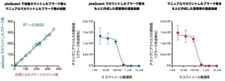 様々な濃度の阻害剤(ミコフェノール酸)で処理したチクングニアウイルスの感染価をプラークアッセイ法で測定する際に,得られたプラークをplaQuestで自動カウントした場合(縦軸)と,マニュアルでカウントした場合(横軸)のそれぞれの数をプロットすると高い相関が得られた(左グラフ)。