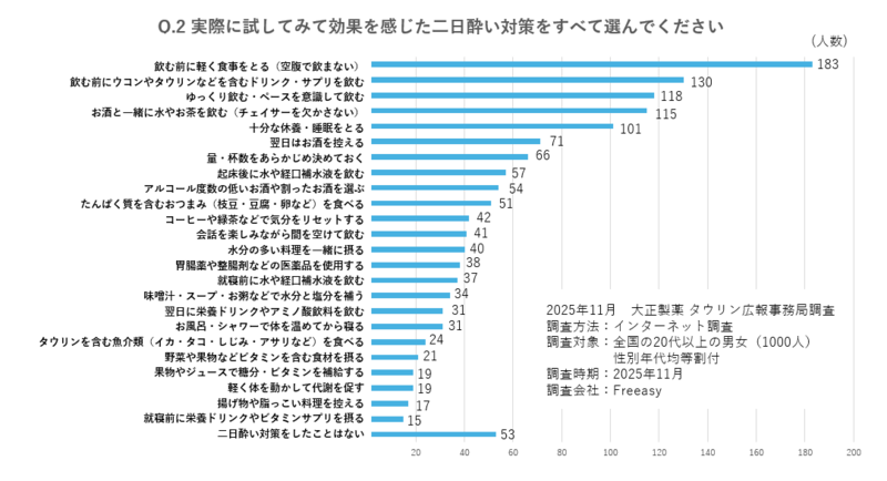 二日酔いの経験者に「実際に効果を感じた二日酔い対策」を聞いたところ、「飲む前に軽く食事を取る(空腹で飲まない)」(183人)、「飲む前にウコンやタウリンなどを含むドリンクやサプリを飲む」(130人)、「ゆっくり飲む・ペースを意識して飲む」(118人)、「お酒と一緒に水やお茶を飲む(チェイサーを欠かさない)」(115人)、「十分な休養・睡眠を取る」(101人)といった対策をしている人が多くいた。