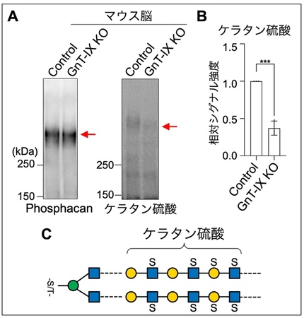 まず、GnT-IX KOマウスの脳を用い、O-Man型糖鎖の先に伸びる糖鎖構造について調べた。その結果、伸びた糖鎖の末端に存在する構造の一つで、ケラタン硫酸8)と呼ばれる構造が、GnT-IX KOマウスで大幅に減少していることがわかった(図2A, B)。
