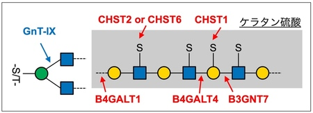ケラタン硫酸は、B4GALT1、B4GALT4、B3GNT7、CHST1、CHST2、CHST6など複数の酵素によって作られる長い糖鎖である (図3) 。ケラタン硫酸を作るこれらの酵素の働きと、O-Man型糖鎖の根本の枝分かれの有無についてはこれまでわかっていなかったが、GnT-IXの欠損によりケラタン硫酸が大きく減少したため、これらの酵素は直鎖よりも枝分かれした O-Man型糖鎖に働きやすい可能性が考えられた。