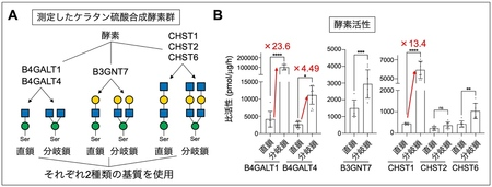 その結果、特にB4GALT1、B4GALT4、CHST1については、直鎖よりも分岐鎖に対して著しく高い活性を示すことがわかった (図4B)。