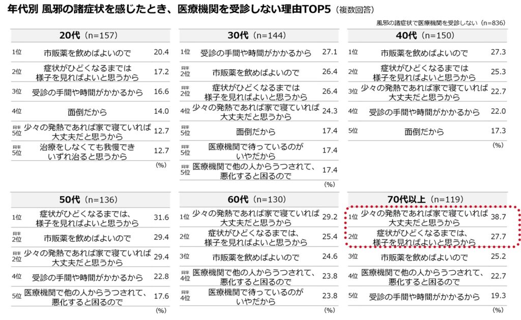 次から次へと出てくる新しい感染症や変異株の話題に頻繁に晒されてきたことも背景にありそうだ。65歳を超えるご高齢の方であっても、インフルエンザや新型コロナウイルス感染症を疑った際、6割の人が医療機関を受診しない実態も明らかとなったた。