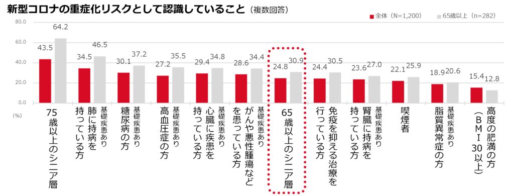 ◆65歳以上の半数(50.0%)は重症化リスクの認識なし。「重症化リスクが高い」と回答した人は65歳以上でおおよそ4人に1人(24.8%)、65歳以上の当事者では30.9%が回答。