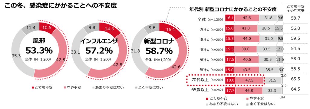◆今冬、約6割(58.7%)が「新型コロナ」感染への不安を感じると回答し、特に70代以上で高い