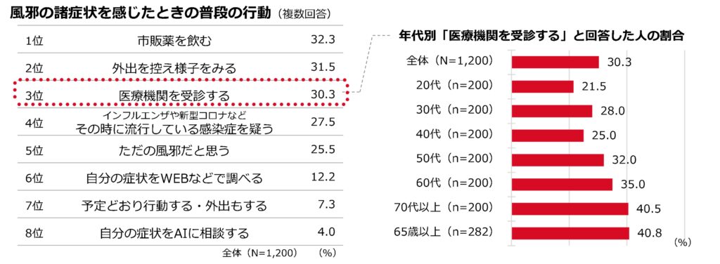 ◆ 風邪の諸症状を感じたとき、「医療機関を受診」すると回答したのは約3割