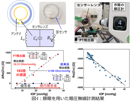 具体的な成果として、6~36 mmHgの眼圧範囲において36.333 Ω/mmHgの感度(従来方式0.198 Ω/mmHgの約183倍)を達成した。