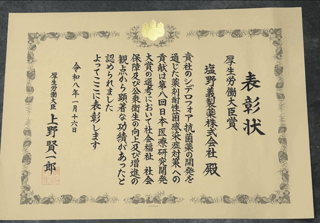 シデロフォア抗菌薬の開発を通じた薬剤耐性感染症対策への貢献」が評価されたもの。表彰式は、16日に首相官邸で開催された。