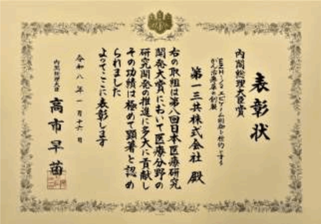 内閣総理大臣賞は、極めて顕著な功績が認められる事例1件に対して授与される。第一三共は、2023年8月に抗悪性腫瘍剤「エンハーツ」の創製等を含む「DXd ADC技術(革新的抗体薬物複合体技術)の開発による新規がん治療薬の創製」で同賞を受賞しており、2度目の受賞となる。
