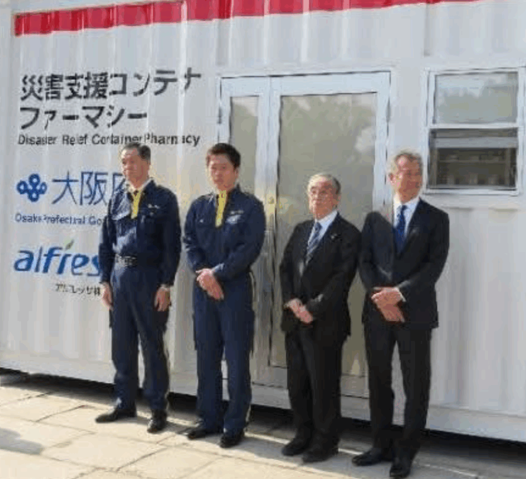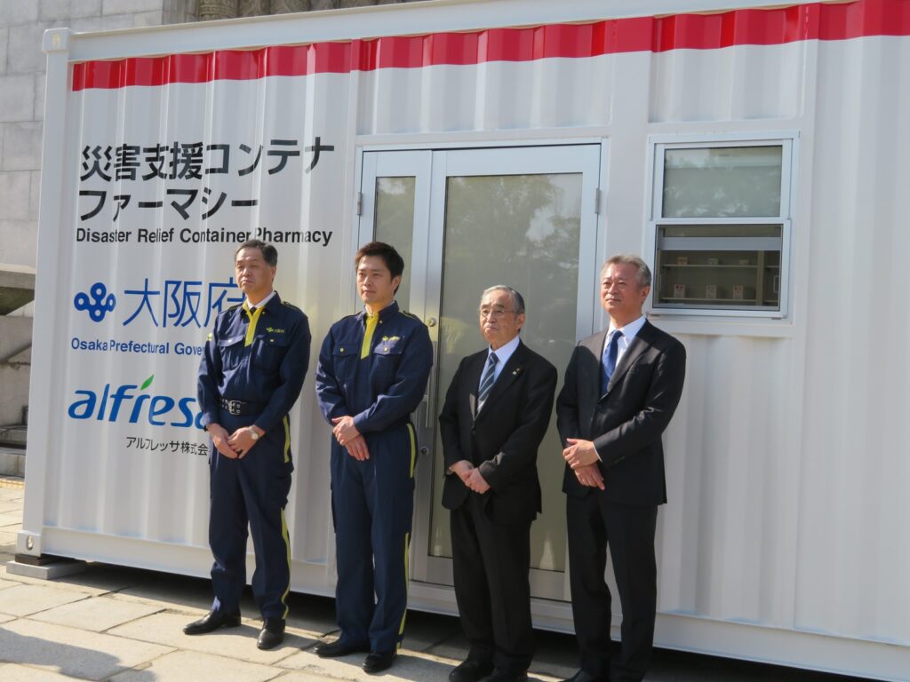 大阪府のコンテナファーマシーの導入は、南海トラフ地震など大規模災害時の医薬品供給途絶リスクへの備えの強化を目的としたもの。コンテナファーマシーは、貨物用コンテナを改造して調剤設備等を搭載したもので、アルフレッサが開発。2023年には静岡県藤枝市にも導入している。