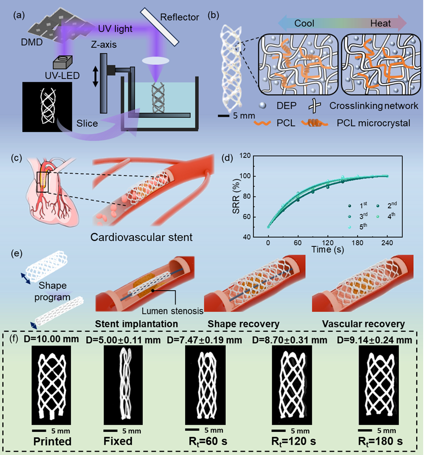 図1(e)に、同研究で開発した血管ステントの作動イメージを示す。カテーテル内では細く折りたたまれた状態で血管内に挿入され、体内に到達すると、体温(37℃)によって自然に元の形に戻り、血管を内側から支える。この仕組みにより、外部から加熱する装置を用いる必要がなくなる。