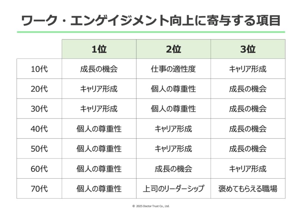 また、70代を除くすべての世代において「キャリア形成」(キャリアに意味を見出せる)と「成長の機会」(自分が成長している)が重要な要素として挙げられている。同結果より年代を問わず「自分が成長している」「キャリアに意味を見出せる」と感じられることが、仕事への前向きな姿勢を支える要素になりうると推測される。