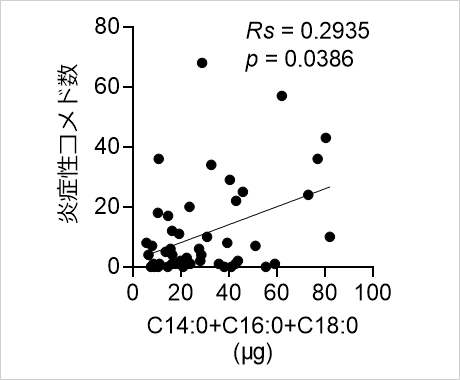 炎症性コメドとヒト皮脂由来の遊離脂肪酸との関連性を明らかにするため、日本人女性 50 名を対象に顔の炎症性コメドの計測および遊離脂肪酸の分析を行った。その結果、主要な遊離脂肪酸であるミリスチン酸、パルミチン酸、ステアリン酸の総量が炎症性コメド数と有意に正に相関することが確認された。