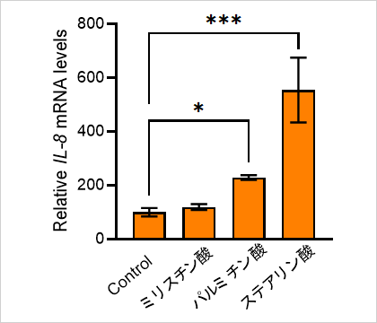 図 2:ミリスチン酸、パルミチン酸、ステアリン酸による IL-8 遺伝子発現への影響