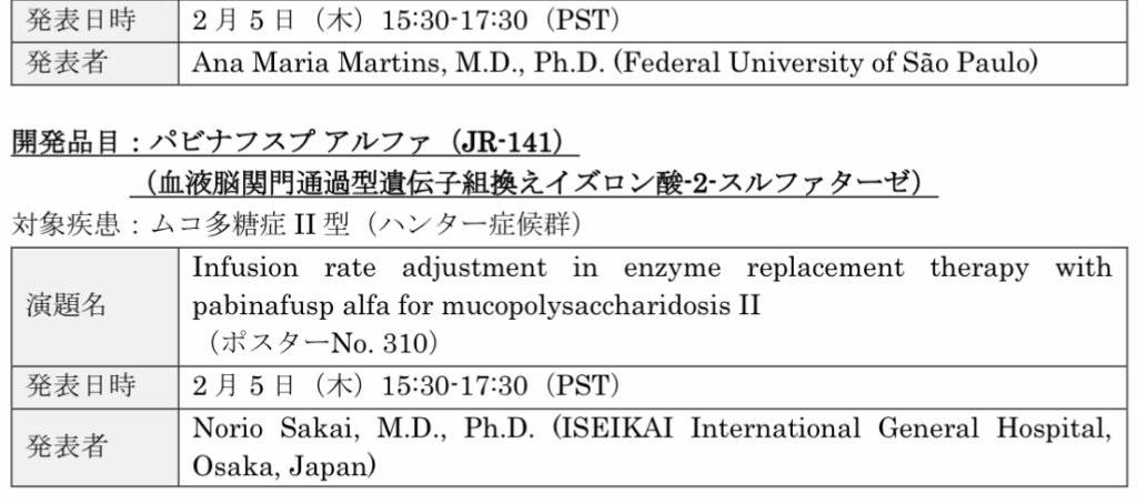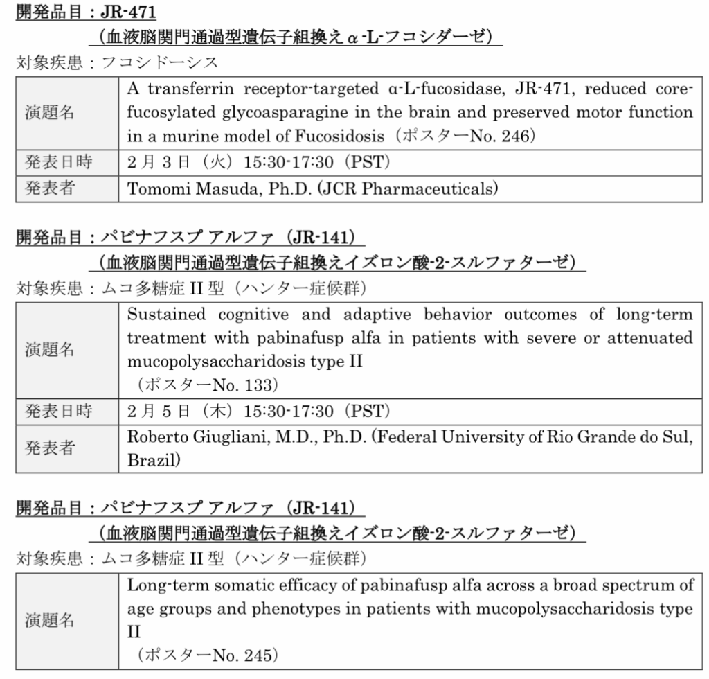 同社は、J-Brain Cargoにより、酵素を体と脳の両方に送達することで、ライソゾーム病におけるアンメット・メディカル・ニーズの解決を目指している。4演題のポスター発表の概要は、次の通り。