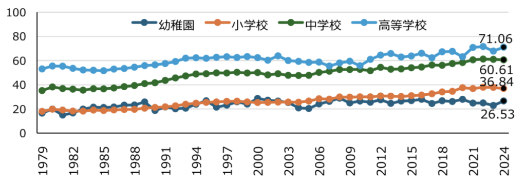 図①:裸眼視力1.0未満の者の割合の推移 (学校保健統計調査/年次統計 学校種別疾病・異常被患率等の推移(昭和23年度~令和6年度)より作成)