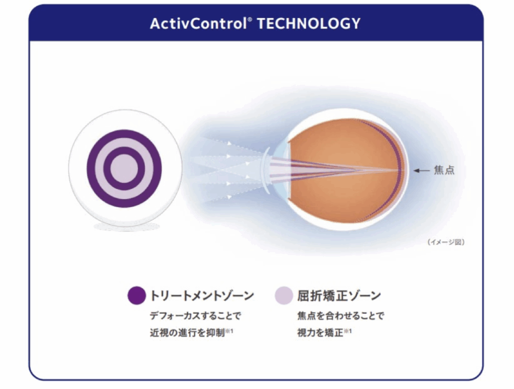 ①は、焦点を合わせることで視力を補正する「屈折矯正ゾーン」、デフォーカスすることで近視の進行を抑える「トリートメントゾーン」が交互に配置された同心円型の二重焦点レンズデザイン「ActivControl テクノロジー」(図②)を採用。視力補正と同時に、近視の原因のひとつである眼軸長の伸長を抑えることで、近視の進行を抑制する効果を発揮する。