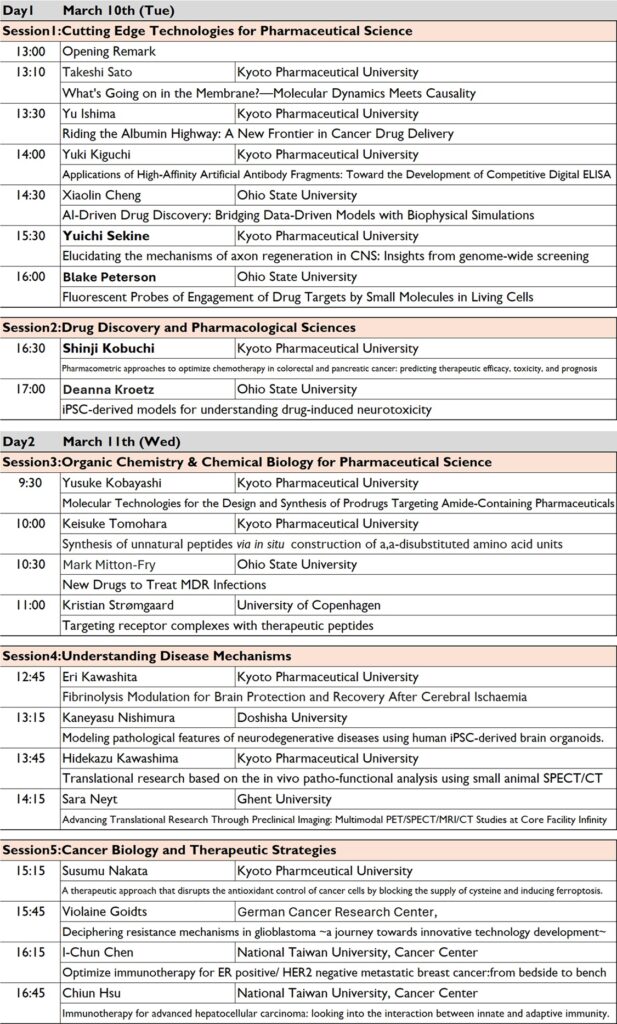 本年度のプログラムは、薬学関連研究分野における国内外の第一線で活躍する20名の卓越した研究者による先端的な講演で構成している。京都薬科大学の高度な研究基盤をもとに、革新的な学術的知見の交流と、次世代の共同研究への戦略的な展望を見据えた、極めて意義深い学術イベントとして企画している。