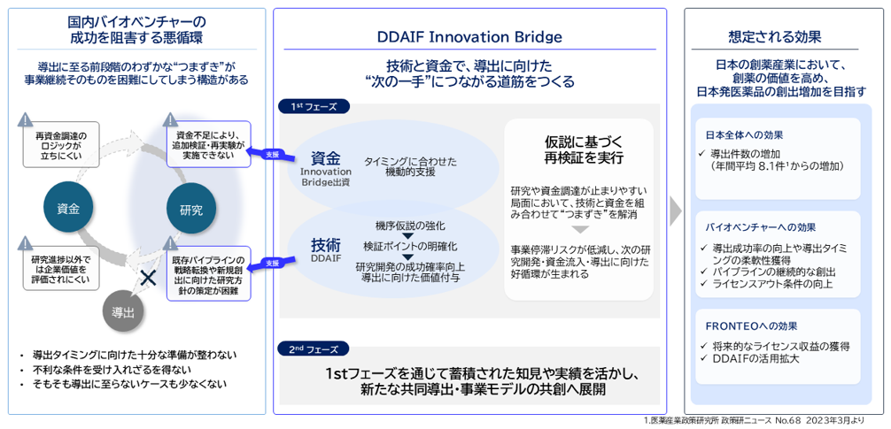 FRONTEOはこうした課題に対し、研究開発段階における「DDAIF」を活用した技術支援と、出資を含む資金支援を組み合わせて提供する新規事業「DDAIF Innovation Bridge」を開始する。