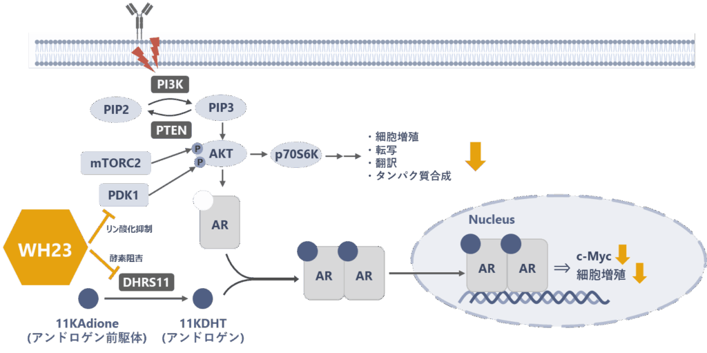 WH23は、TNBC細胞(MDA-MB-453)において、DHRS11によるアンドロゲン供給を断つだけでなく、ARの発現自体も抑制し、下流の増殖シグナルを抑制することがわかった。また、がん細胞の生存に関わるPI3K/AKT経路も阻害することが判明した。
