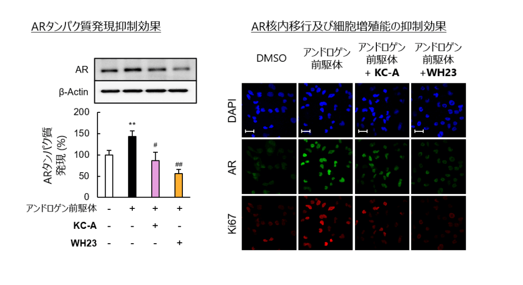 図2. KC-AとWH23のAR発現抑制およびアンドロゲン依存性細胞増殖抑制効果