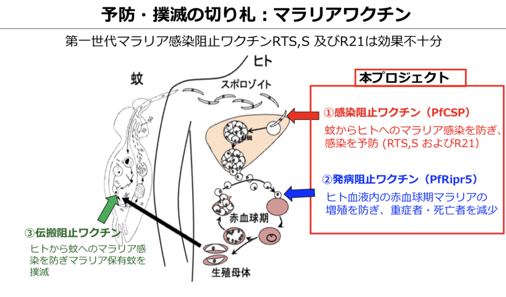 マラリアワクチンの作用メカニズムは、①感染阻止ワクチン(PfCSP)、②発病阻止ワクチン(PfRipr5)、③伝搬阻止ワクチンーの3つに分かれる。①は、蚊からヒトへのマラリア感染を防ぎ、感染を予防(RTS,S およびR21)する。②は、ヒト血液内の赤血球期マラリアの増殖を防ぎ、重症者・死亡者を減少させる。③は、ヒトから蚊へのマラリア感染を防ぎマラリア保有蚊愛媛大学との新規マルチステージマラリアワクチン共同研究を撲滅させる。