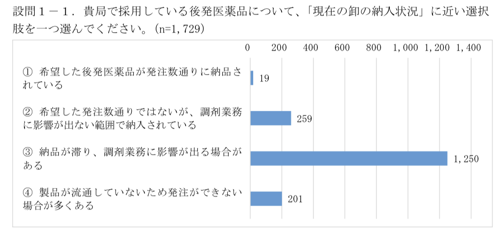 後発医薬品が発注通り納品されている薬局は1729件中わずか19件であり、「約84%以上の薬局が供給不安定で調剤業務に支障がある」と回答。先発医薬品においては、「70%の薬局が供給不安定で調剤業務に支障がある」との結果を得ている。
