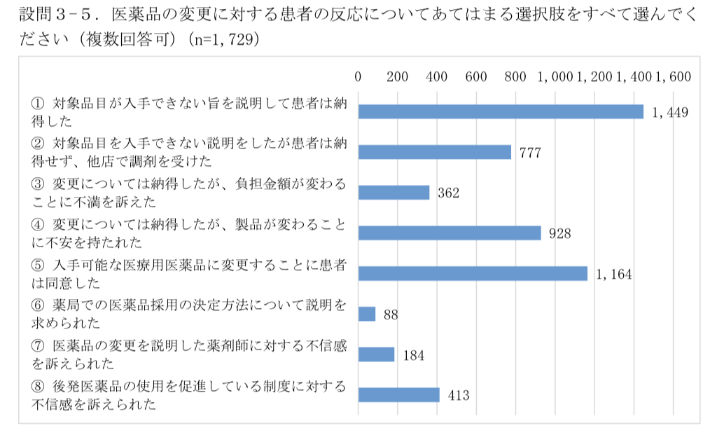 また、医薬品の変更に対する患者の反応は次の通り。