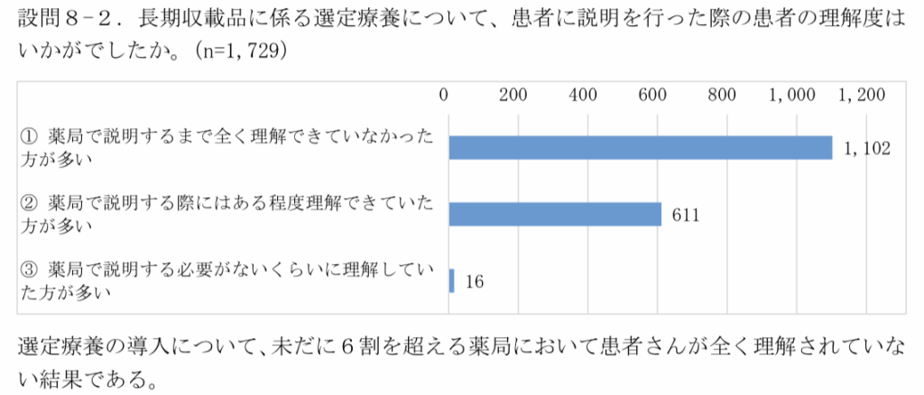 選定療養については、患者への説明に要する時間は平均5分であり、「薬局において説明するまで全く理解できていなかった方が多い」と答えた薬局は64%であった。この結果から「国民への周知は進んでいないと考えられる」と考察する。