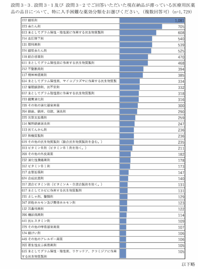 では、現在、どのような医薬品が不足しているのか。医療用医薬品の品目に関する入手状況の設問では、62.5%の薬局が「鎮咳剤が入手困難」と回答しており、不足品目は、1位:鎮咳剤(1081軒)、2位:去たん剤(705軒)、3位:抗生物質製剤(608軒)の順となり、これらは高い割合であった。