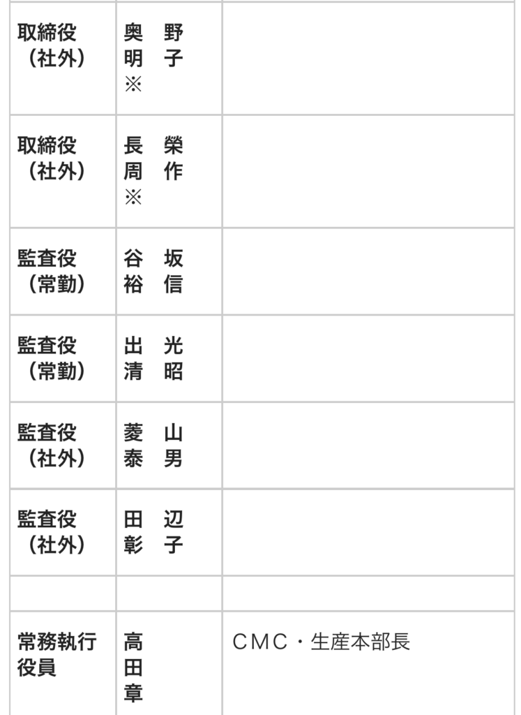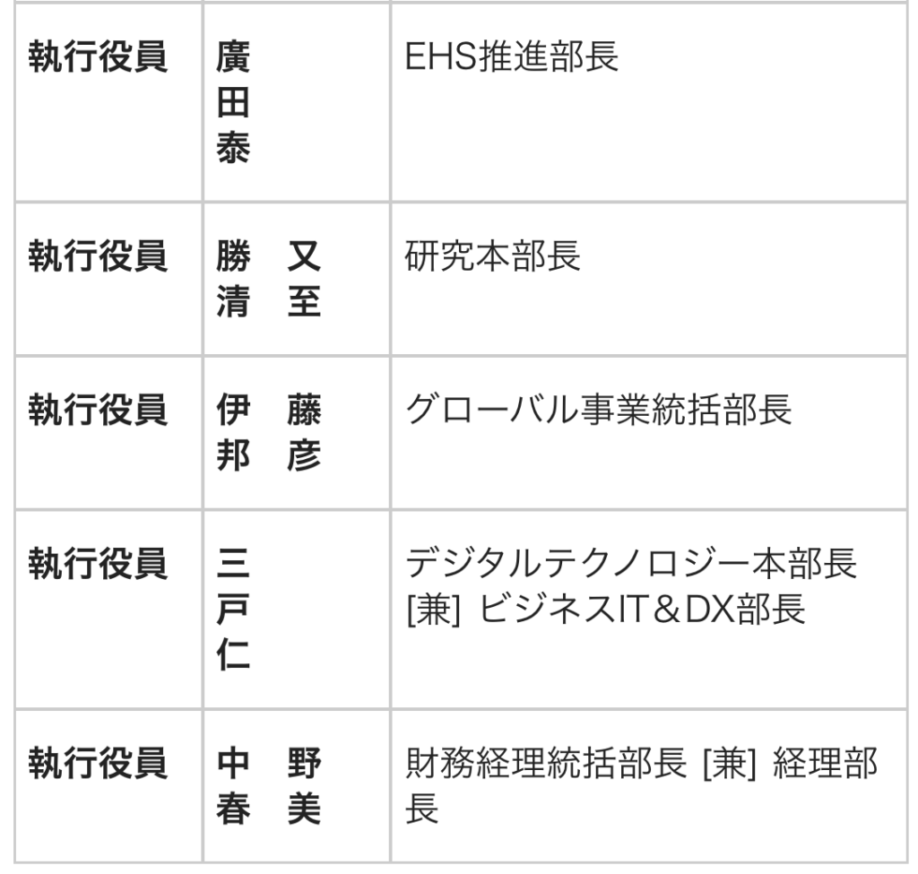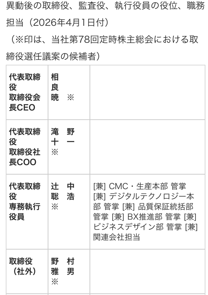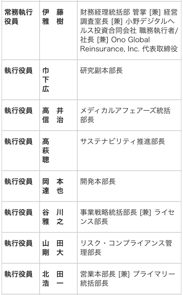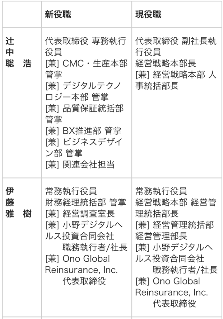 取締役および執行役員人事 小野薬品 2026.03.04 小野薬品は、次の取締役および執行役員人事を発表した。取締役人事については、6月開催予定の定時株主総会およびその後開催予定の取締役会を経て正式決定する。 1、 取締役人事(2026年6月予定):◎現任取締役6名全員、取締役を重任予定(代表者変更なし)※うち、野村雅男、奥野明子、長榮周作の3名は社外取締役を重任予定 2、執行役員人事(2026年4月1日付):下記以外の現任執行役員は重任予定◎異動 【参考】