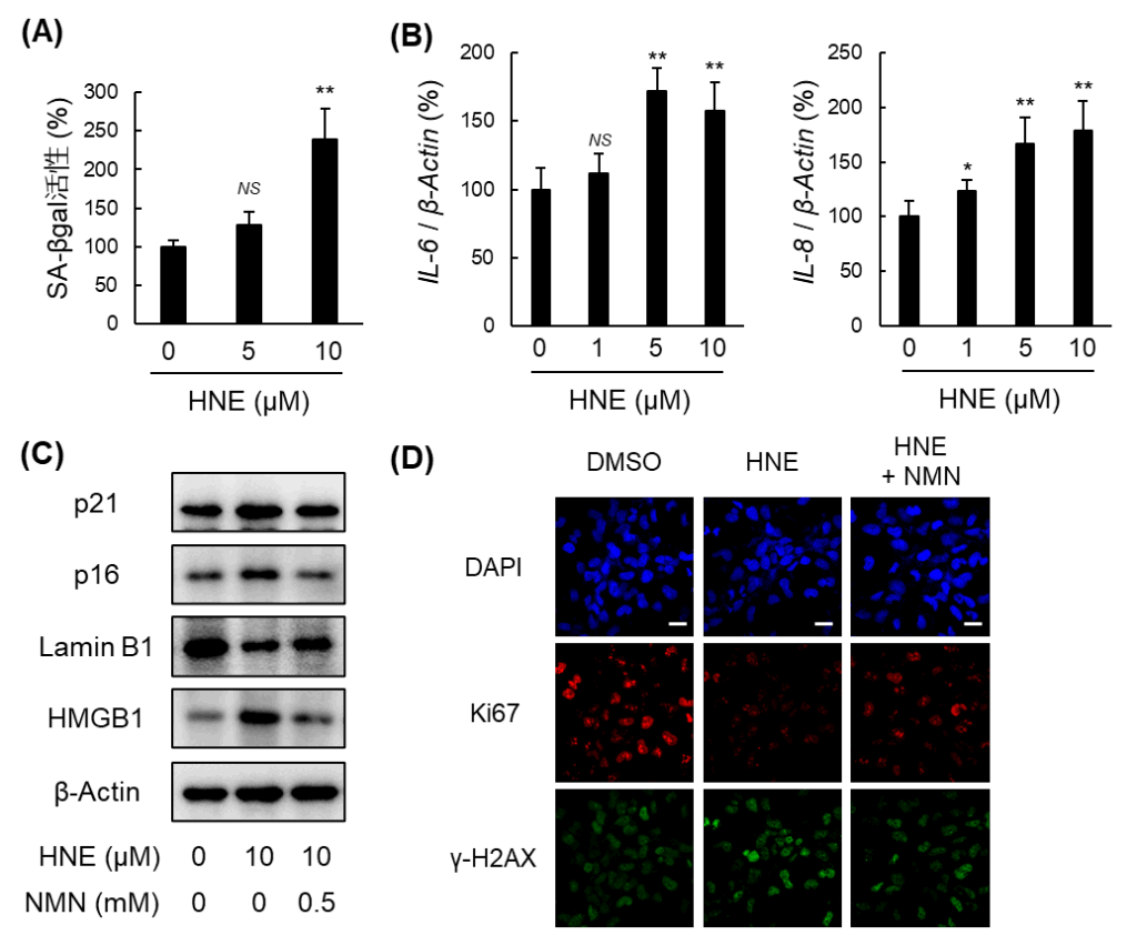 図1. HNE誘導性細胞老化に対するNMNの抑制効果 (A) SA-βgal活性. (B) SASP因子のmRNA発現. (C) 細胞老化関連因子のタンパク質発現. (D) 増殖マーカーとDNA損傷マーカーの発現