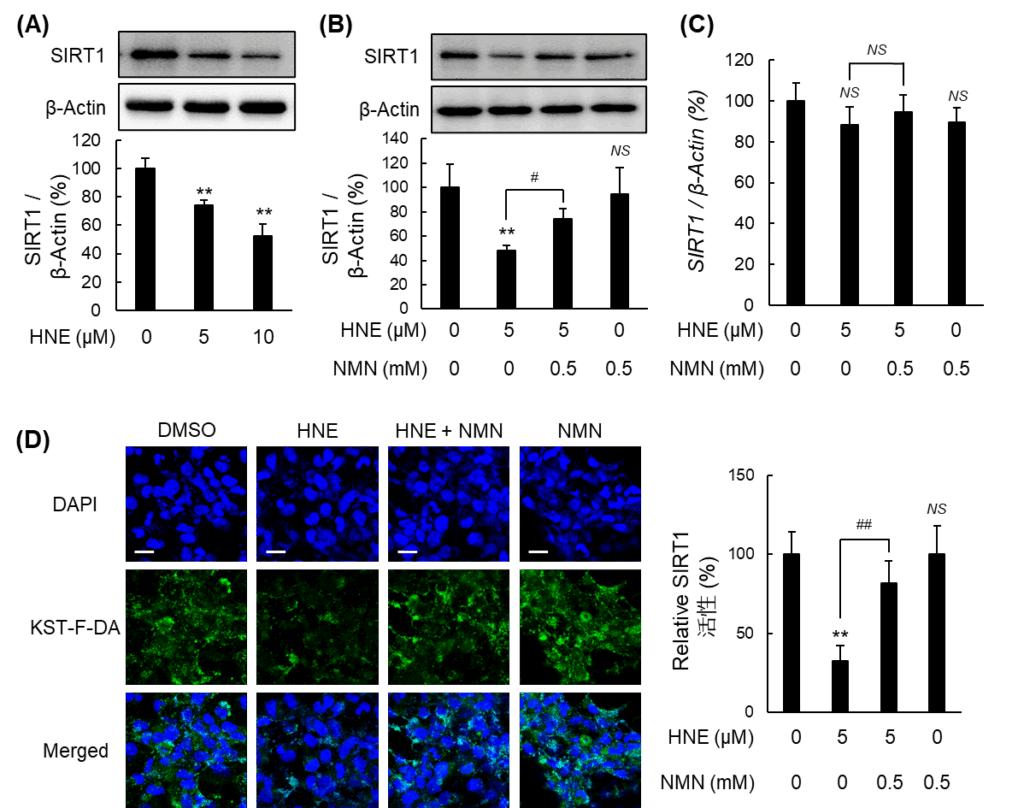 次に、NAD+前駆体であるNMNの保護効果を検証した。NMNの事前投与によって、HNEによる細胞老化を有意に抑制し、低下した細胞内NAD+レベルと長寿遺伝子SIRT1のタンパク質発現および酵素活性を回復させた。