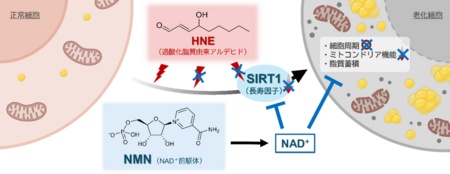 一方で、加齢に伴い体内では有害なアルデヒド(HNE等)が蓄積し、細胞内のエネルギー代謝に不可欠なNAD+濃度や長寿遺伝子SIRT1の活性が低下することが知られている。