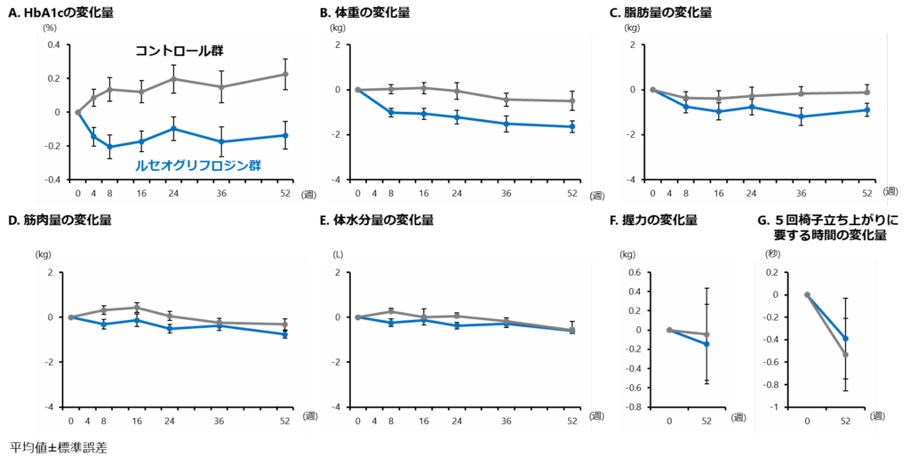 その結果、ルセオグリフロジン群では、コントロール群と比較して、血糖管理指標であるHbA1cが平均0.36%改善し、体重も平均1.15kg減少した。一方、SMI(骨格筋量指数)、握力、5回椅子立ち上がり時間などには両群で差はなく、筋肉量や筋力、身体機能への悪影響は認められなかった。また、重症低血糖や脱水、ケトアシドーシスなどの重大な副作用も確認されなかった。