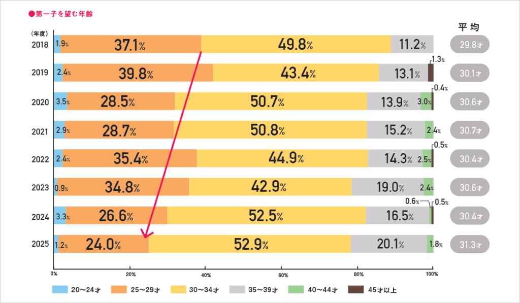 加えて女性は、2018年は約2人に1人(51.8%)が20代までに第一子を望んでいたが、2025年は約4人に1人(24.3%)まで減少した。【グラフ無し】