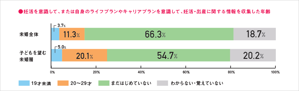 若年未婚男女の「妊活または自身のライフプラン・キャリアプランを意識して、『妊活・出産』の情報収集をし始めた年齢」について聞いたところ、全体では66.3%、子どもを望む層であっても54.7%と、半数以上が情報収集をまだ開始していなかった。