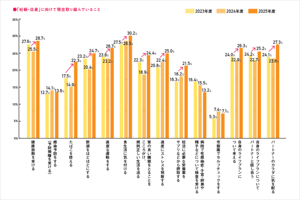 既婚男女に対し、「妊娠・出産に向けて現在取り組んでいること」を質問したところ、昨年からほぼ全ての項目が上昇。主に、健康的な生活習慣や、ライフプランの検討、パートナーの体に気を配ることが伸びており、妊活の取り組みは広がりを見せている。